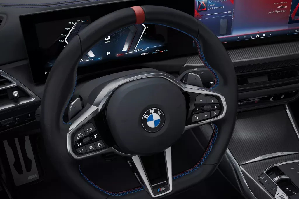 Slide into the M3's driver-centric cockpit designed to elevate your driving experience. High-performance materials and M-specific details create a thrilling and sophisticated environment.  A user-friendly infotainment system keeps you connected, while a digital instrument cluster puts all driving information within easy reach. A head-up display keeps your eyes focused on the road ahead.
